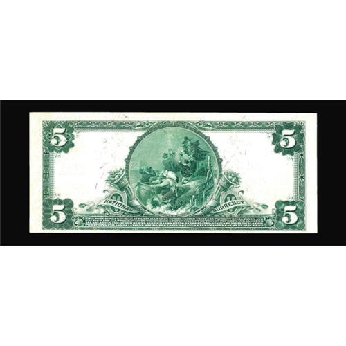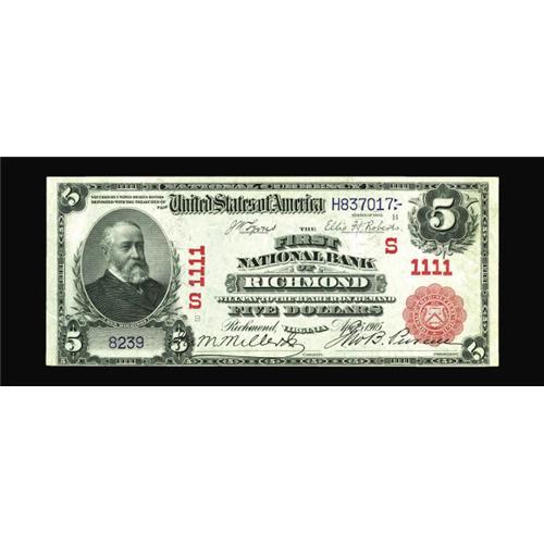 <B>Richmond, VA</B></I> - $5 1902 Red Seal Fr. 587 <B>The First NB</B></I> Ch. # (S)1111<BR>An absolutely beautiful Red Seal that shows just minute handling. Embossing and natural paper surfaces are merits of this $5. The bank officer signatures are precisely printed on the white paper and the red overprint is striking. <B>Choice About Uncirculated.</B></I>