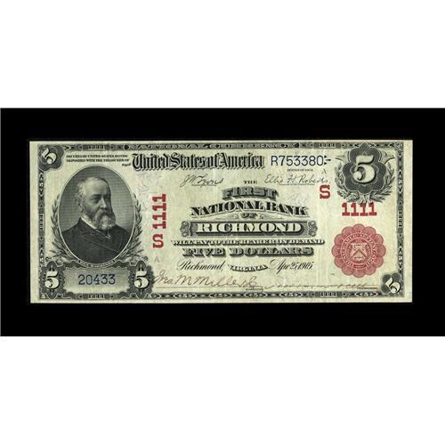 <B>Richmond, VA</B></I> - $5 1902 Red Seal Fr. 587 <B>The First NB</B></I> Ch. # (S)1111<BR>A newly discovered Red Seal from the "Four Aces" bank. Sharp <B>Very Fine+,</B></I> with a vivid red overprint, a most attractive note worthy of the finest of collections.<BR><I>From The George P. Hammerly Collection</B></I><BR><BR><b>Shipping:</b> Coin/Currency (<a target="_blank" href="http://www.heritageauctions.com/common/shipping.php">view shipping information</a>)
