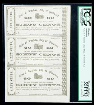 Richmond, VA - City of Richmond Uncut Sheet of Three. 60¢ Apr. 14, 1862. PCGS Choice About New 55PPQ. Three nicely embossed, uncut notes that have plenty of visual appeal.