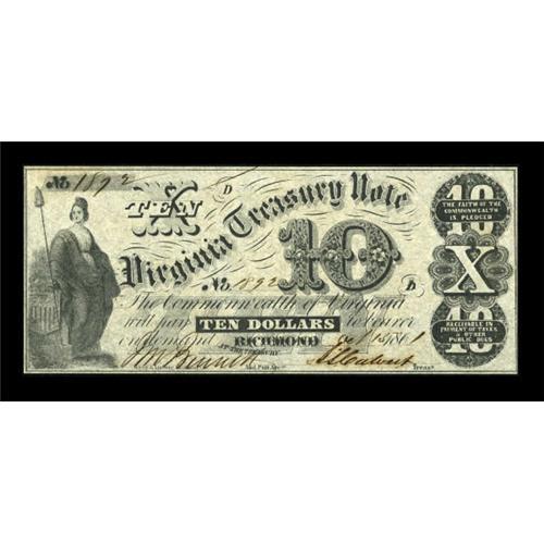 <B>Richmond, VA- Virginia Treasury Note</B></I> $10 Oct. 15, 1861 Cr. 4<BR> This<B> Extremely Fine-About Uncirculated </B></I>example depicts Liberty standing with pole and liberty cap by shield at left. <BR><BR><b>Shipping:</b> Coins & Currency (<a target="_blank" href="http://www.heritageauctions.com/common/shipping.php">view shipping information</a>)