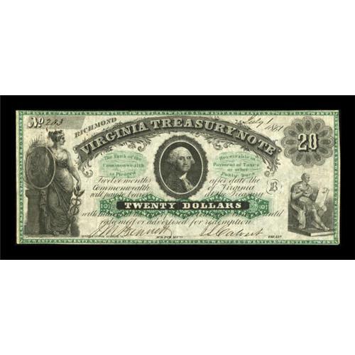 <B>Richmond, VA- Virginia Treasury Note</B></I> $20 July 1, 1861 Cr. 3<BR> This <B>Very Fine </B></I>example has the appearance of a higher grade piece, however a tear at upper left, most likely caused by the note spending time underneath a paper clip is noticed. Also light rust stains and small paper erosion are also noted on back. Low serial # 203 is perhaps one of less than 400 believed to exist (if even that many).<BR><BR><b>Shipping:</b> Coins & Currency (<a target="_blank" href="http://www.heritageauctions.com/common/shipping.php">view shipping information</a>)