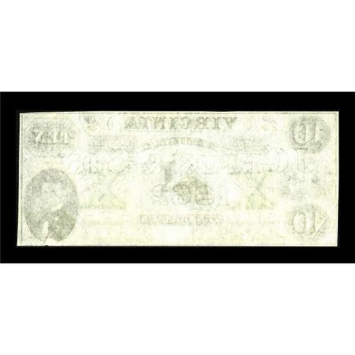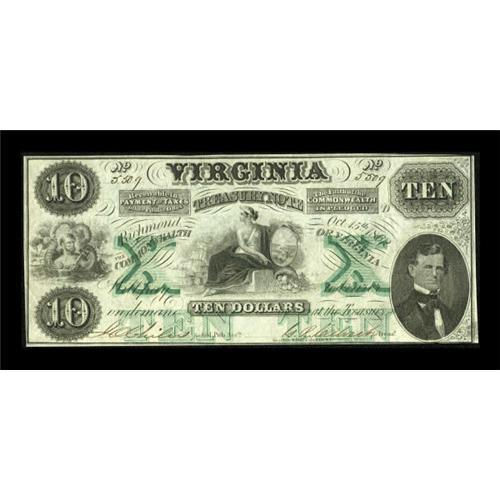<B>Richmond, VA- Virginia Treasury Note</B></I> $10 Oct. 15, 1862 Cr. 12<BR> There are six different varieties of this type, with this example having the "J. Green & Sons 1862" watermark. A corner fold is all that keeps this beauty from the CU grade. Listed as a Rarity 9 (16 - 50 known) in <I>A Guide Book of Southern States Currency </B></I>by Hugh Shull, a required reading for those wishing to collect Obsoletes from the South. <B>Choice About Uncirculated</B></I>.<BR><BR><b>Shipping:</b> Coins & Currency (<a target="_blank" href="http://www.heritageauctions.com/common/shipping.php">view shipping information</a>)