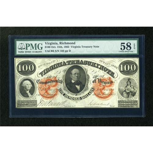 <B>Richmond, VA - Virginia Treasury Note</B></I> $100 Oct. 15, 1862 Cr. 6<BR> This is a Keatinge & Ball product with a portrait of Civil War era Governor John Letcher. He was governor from 1860-63. <B>PMG Choice Uncirculated 58 EPQ</B></I>.<BR><BR><b>Shipping:</b> Coins & Currency (<a target="_blank" href="http://www.heritageauctions.com/common/shipping.php">view shipping information</a>)
