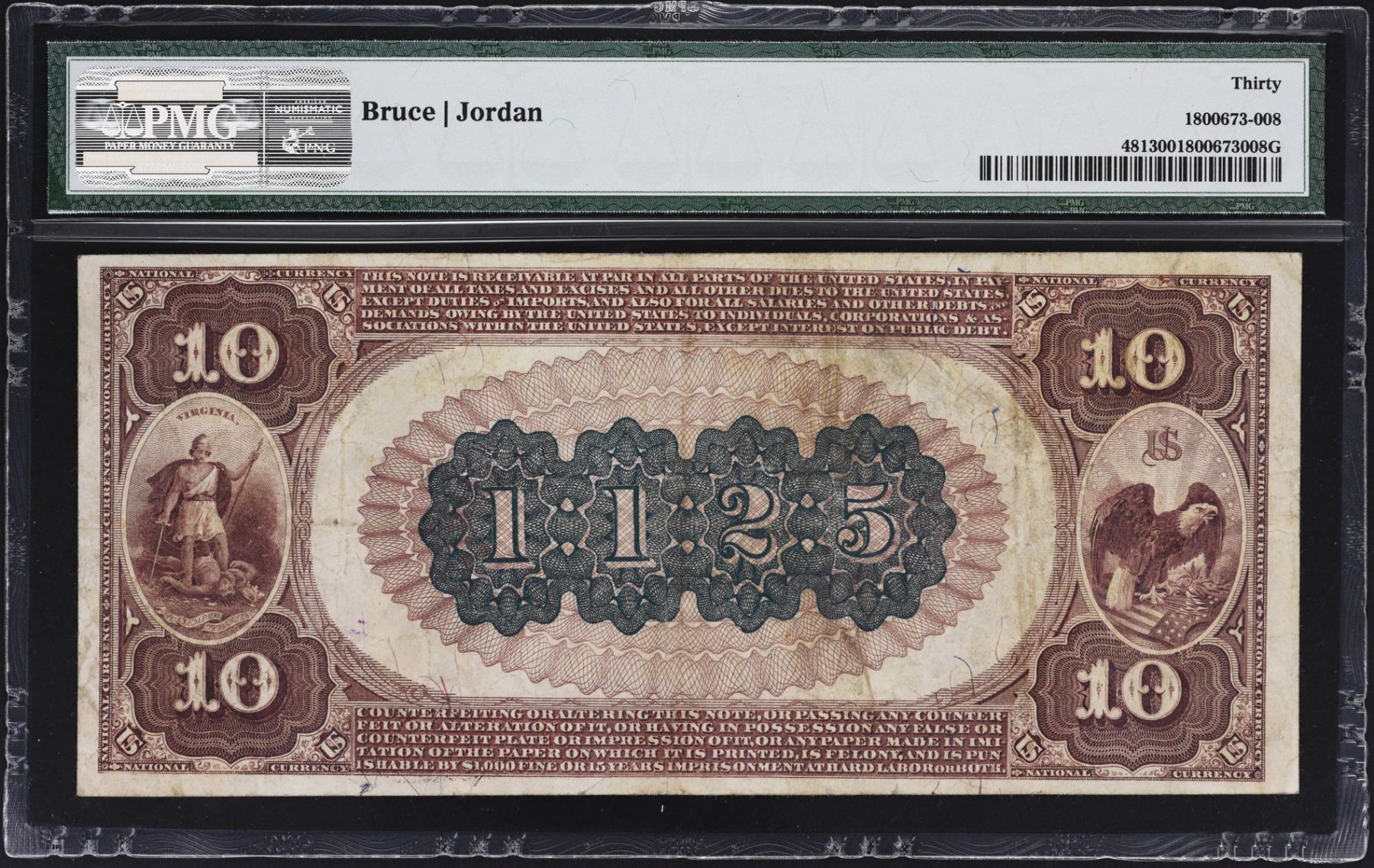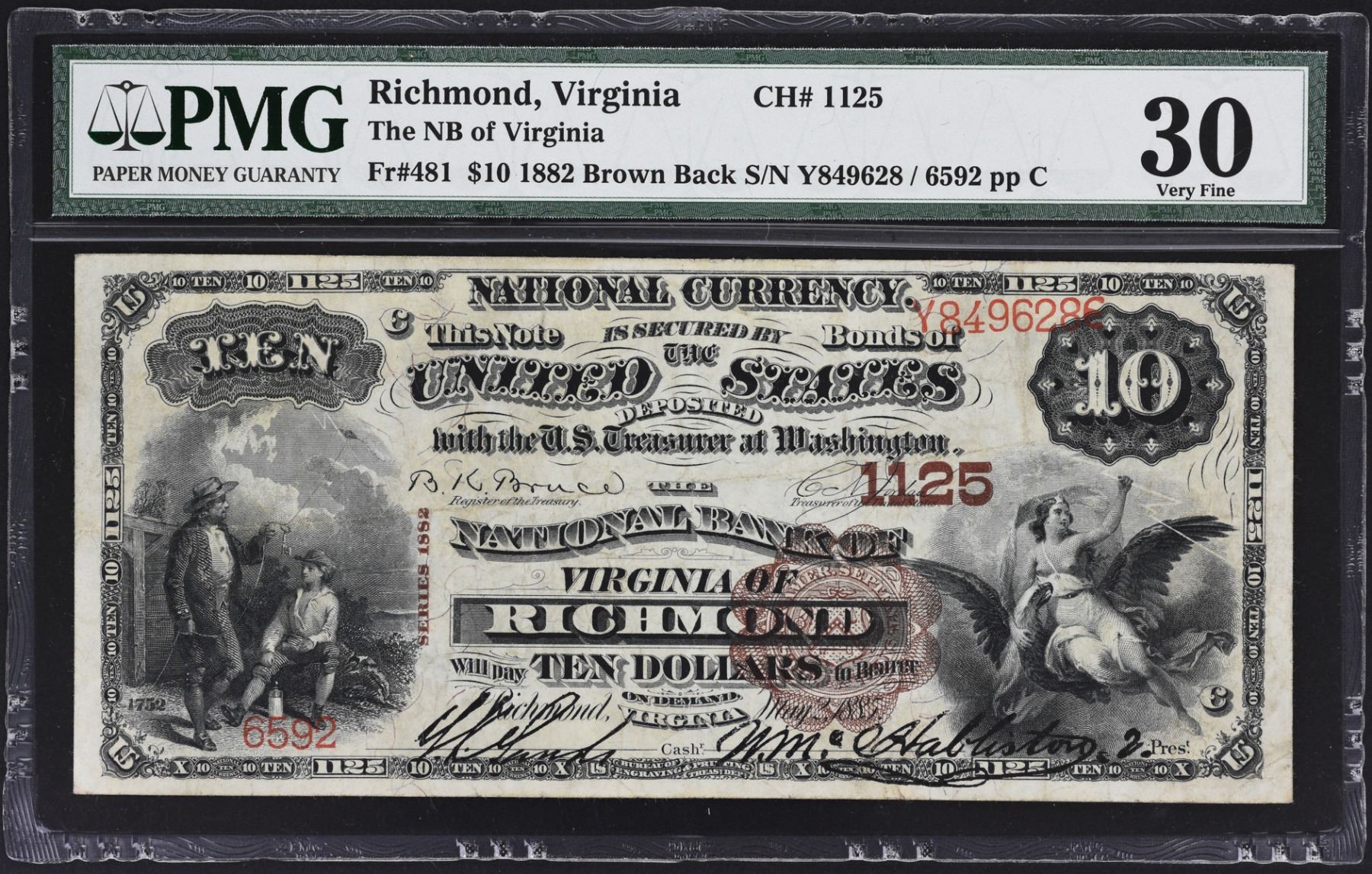 A difficult Richmond charter with this note being one of just 32 notes known, all large-size. This $10 brown back is one of just two for the denomination and type and the finer of that pair. A nicely centered example which follows the trend in this collection as not a single piece is found below the Very Fine level.