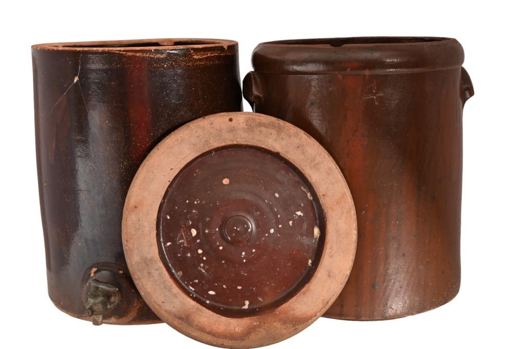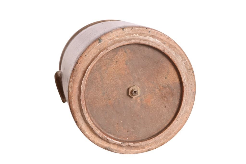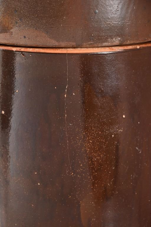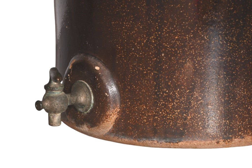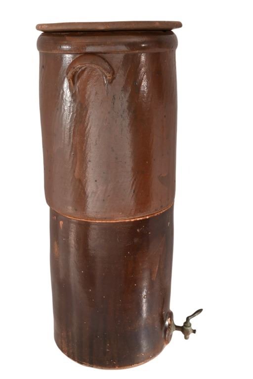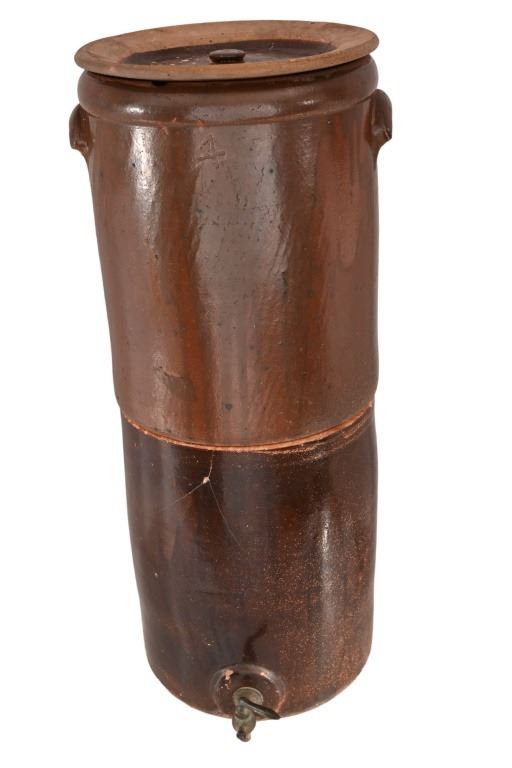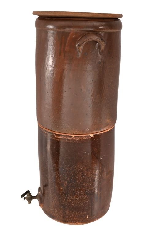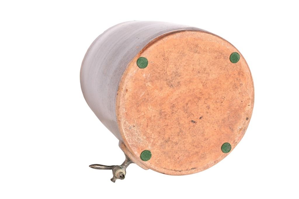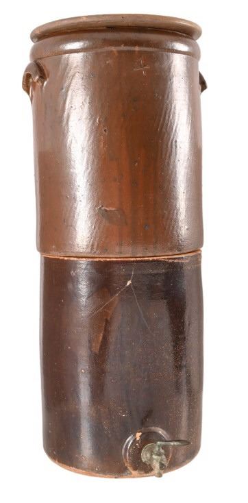 Very Rare! Possibly the only one! Richter Double 4 Gallon Water Crock w/ lid and Original Spout. This water has two 4 gallon crocks that sit one on top of the other. The top crock is groved on the bottom to fit flush on the top of the bottom crock. There is a copper fitting on the inside of the top crock that allows the liquid from the top to flow to the bottom crock as the water levels lower.
