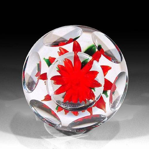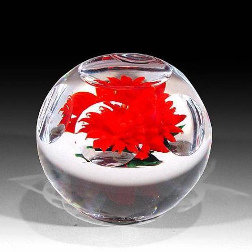 Rick Ayotte 2003 miniature paperweight, with an upright multi-tiered bright red dahlia, on clear ground; six and one facets. Signed/dated. Diameter 2 1/4".