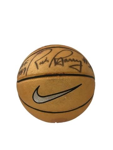 Golden painted Nike basketball signed by Rick Barry # 24 Hall of Fame 1987. Personally signed: “Barry - happy hooping”. Rick Barry, the legendary basketball player, was inducted into the Naismith Memorial Basketball Hall of Fame in 1987. His remarkable career spanned both the ABA (American Basketball Association) and the NBA (National Basketball Association).