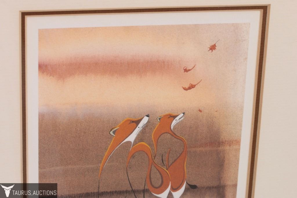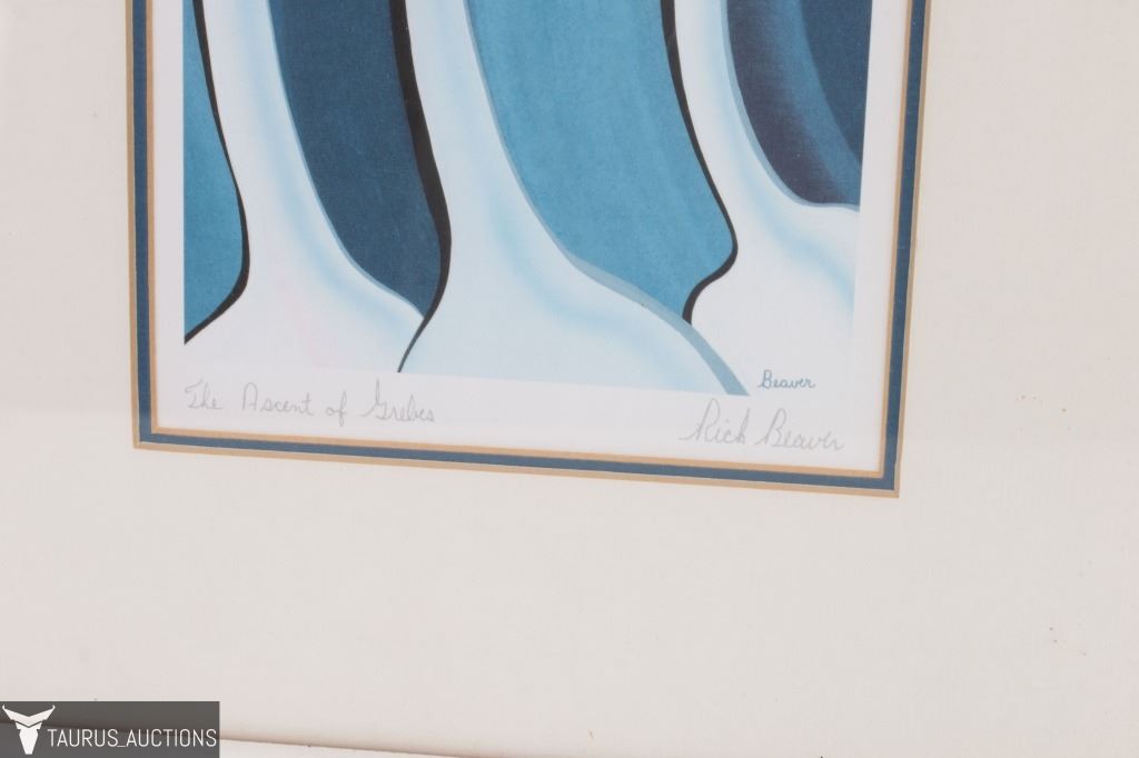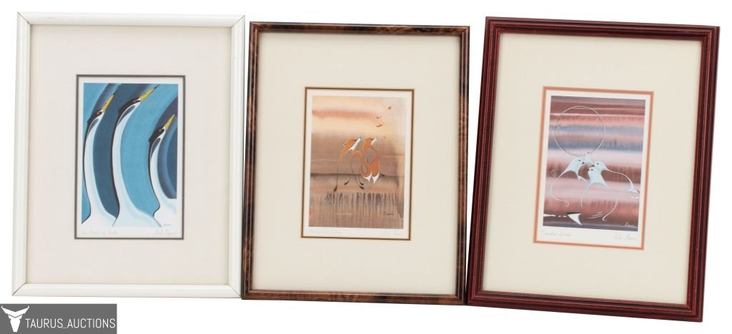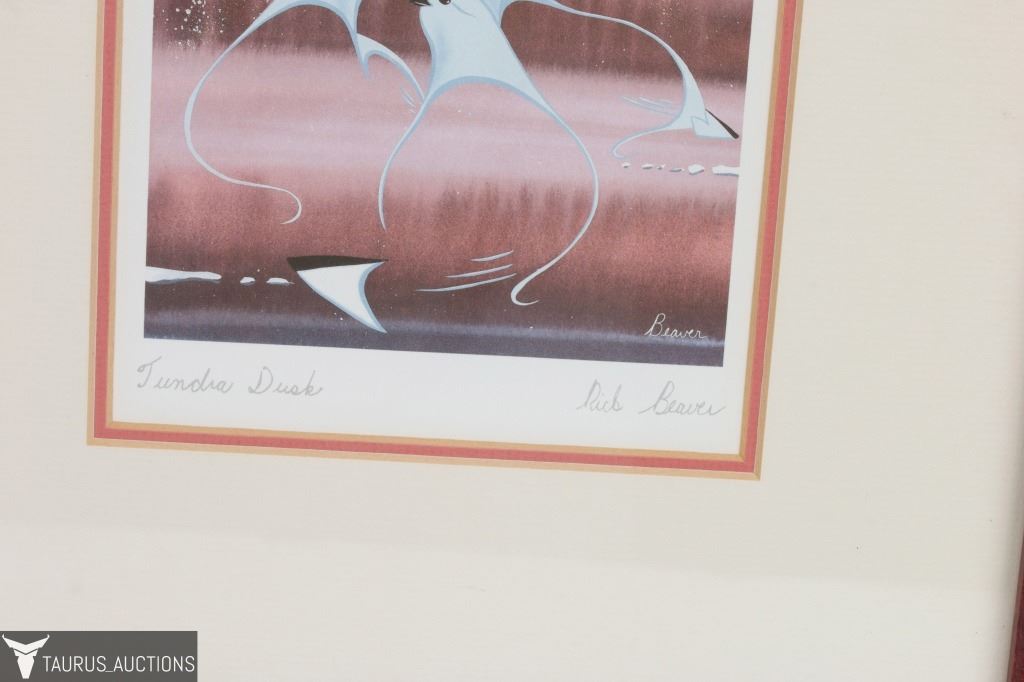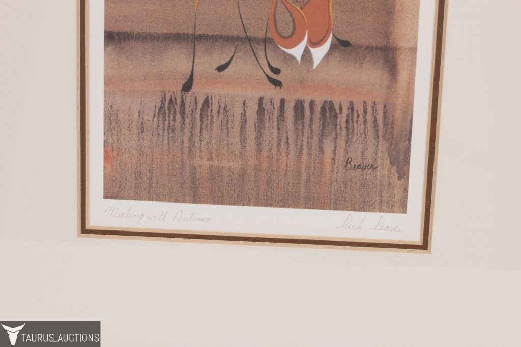 Item/Description: Three framed prints by Native American artist, Rick Beaver. Includes: "The Ascent of Grebes" depicting three aquatic diving birds; "Meeting with Autumn" featuring a pair of foxes watching leaves fall; and "Tundra Dusk" with four stylized birds below a large rising moon. All are signed and titled in plate. Artist bio adhered to the back of one frame.