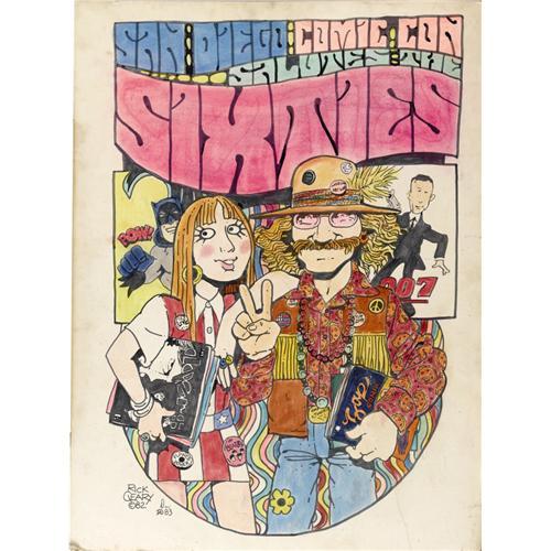 <B>Rick Geary - San Diego Comic Con Program Cover Original Art (1982).</B></I> If any one comics artist could be associated with the annual Comic Con held every summer in San Diego, it would have to be Rick Geary. Geary, who hails from San Diego, designed the convention's colorful Toucan logo; he also can be found there each year, tucked away in the Artist's Alley section. This incredible (and huge -- measuring a hefty 30" x 40"), colorful poster-like program cover salutes the 1960s, and features a typical "odd couple" from that era -- she's a mod, with Doors albums, Beatles buttons, and "pressed" hair; he's a long-haired hippie, with a copy of <B>Zap Comix</B></I>, "love beads," and a groovy paisley shirt. The art is done in markers on heavy illustration board, and is in Very Good condition. Far out, man!