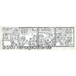 Rick Hackney - Original Comic Strip Art for Sir Bagby, Group of Two Dailies dated 7-1-59 and 9-26-59 (McClure Syndicate, 1959). A rather obscure title, Sir Bagby had a ten-year run in newspapers from 1959-1969. Created by brothers Rick (art) and Bill (script) Hackney, this was a lighthearted look at life during Medieval times. The two strips offered here are in very good condition, the most noticeable defect being a vertical crease down the center of each. The piece dated 9-26 measures approximately 20" x 6.75" overall, while the piece dated 7-1 measures approximately 22.75" x 7.25" overall. Each is signed by the artist and writer. Important notice: Heritage usually auctions material at the rate of 200-250 lots per hour. On some occasions eBay Live bid software or the Internet may not be able to keep up with the pace of the auction. We recommend placing a realistic absentee bid now as insurance to avoid disappointment. Occasionally the auctioneer may eliminate or reject an eBay Live bid, and the auctioneer may also reopen a lot after the close of the eBay live bidding (usually because we missed an audience bid), and may reject your bid even if it shows you as the winning bidder. By bidding via eBay Live, you agree that Heritage may award the lot to another bidder at its sole discretion under the circumstances described above or any other reasonable circumstances. Since eBay bids are not shown to us until we open the lot on the floor, we treat those bids just like floor bids. In most cases the floor responds before the eBay bid is presented to us, due to Internet lag time, so for consistency we have made it a policy that floor bids are always considered first over tie eBay live bids. Also please note that all Heritage lots purchased through eBay Live carry a 20% Buyer's Premium. Please make sure you read the Terms and Conditions before you bid.