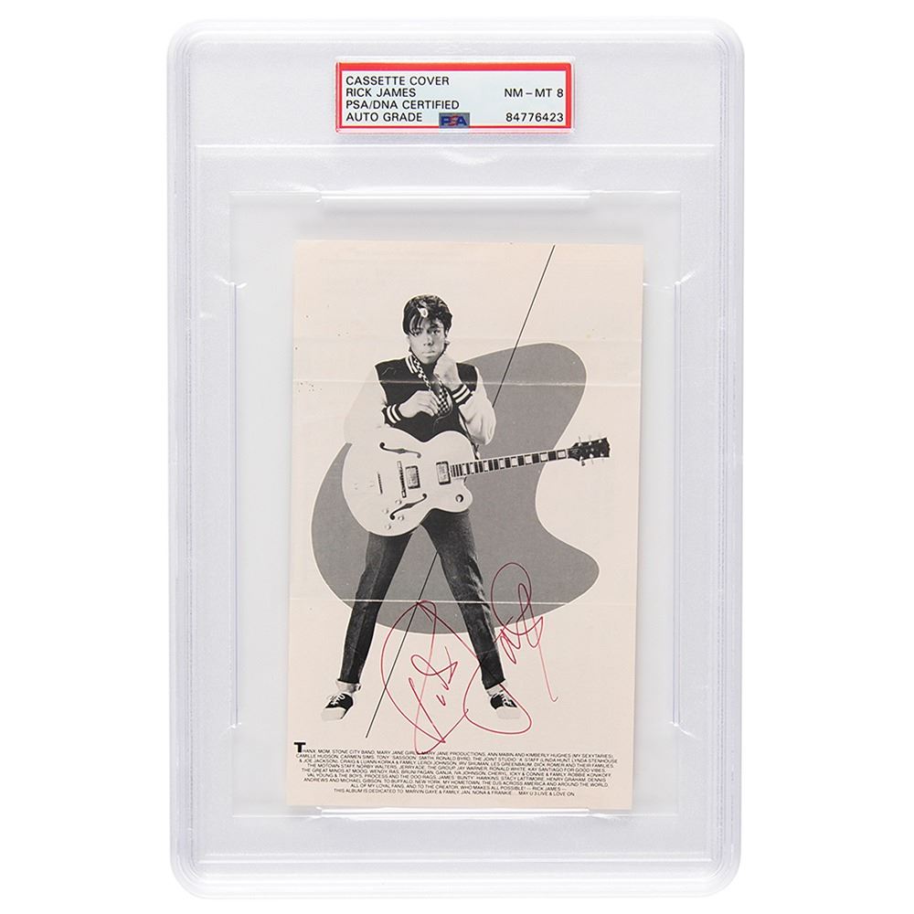 Cassette tape J-card for the Rick James album Reflections: All the Great Hits, measures 4 x 6.5 unfolded, signed on the inside in red ballpoint. In fine condition, with the usual cassette sleeve folds. Encapsulated and graded by PSA/DNA as "NM-MT 8."