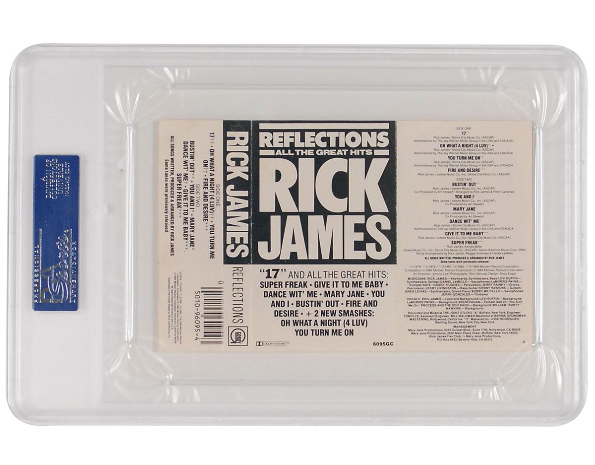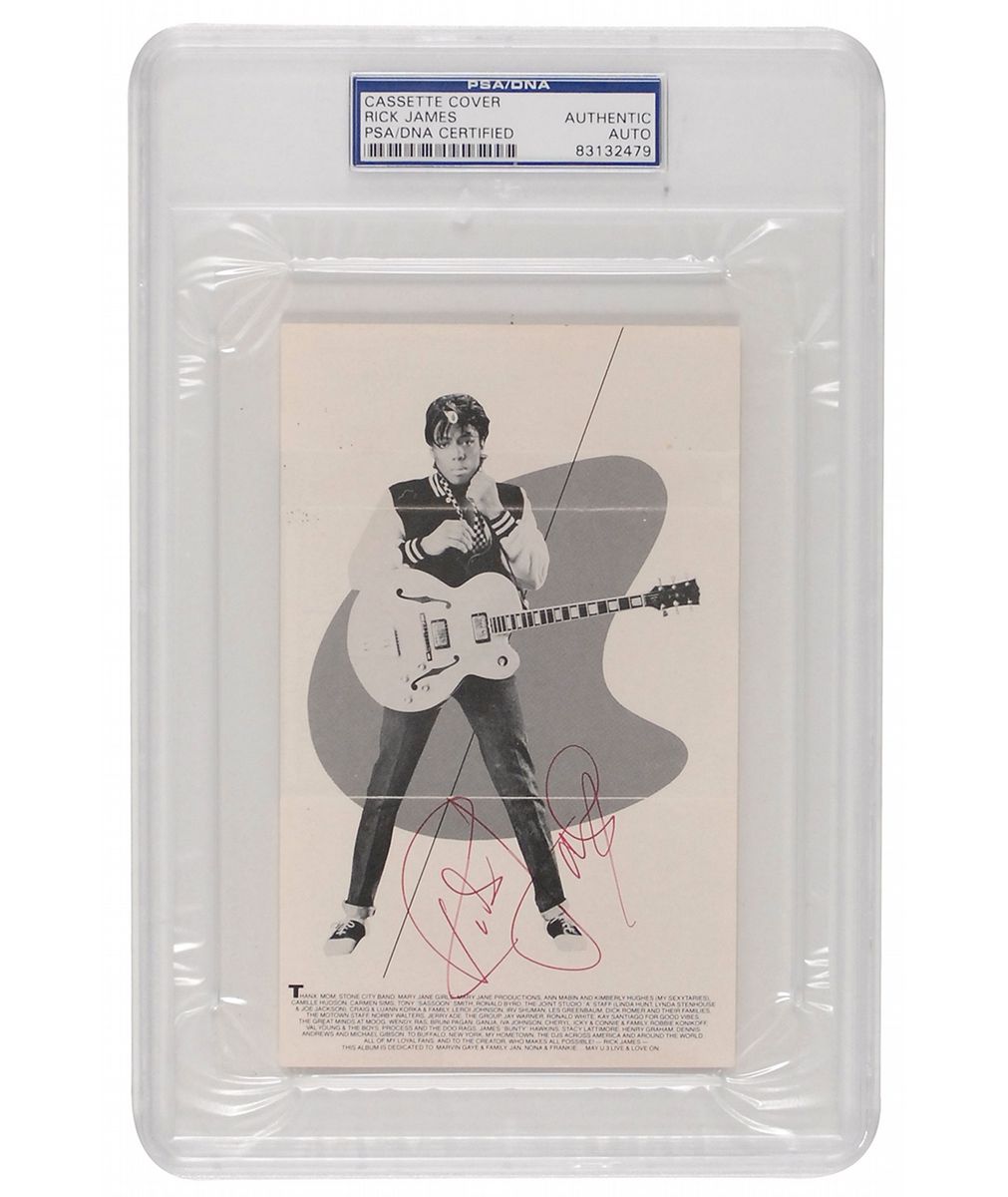 Cover from the cassette tape of Reflections: All the Great Hits, signed on the inside image in red ballpoint. Encapsulated in a plastic PSA/DNA authentication holder. In fine condition, with horizontal folds from cassette case.
