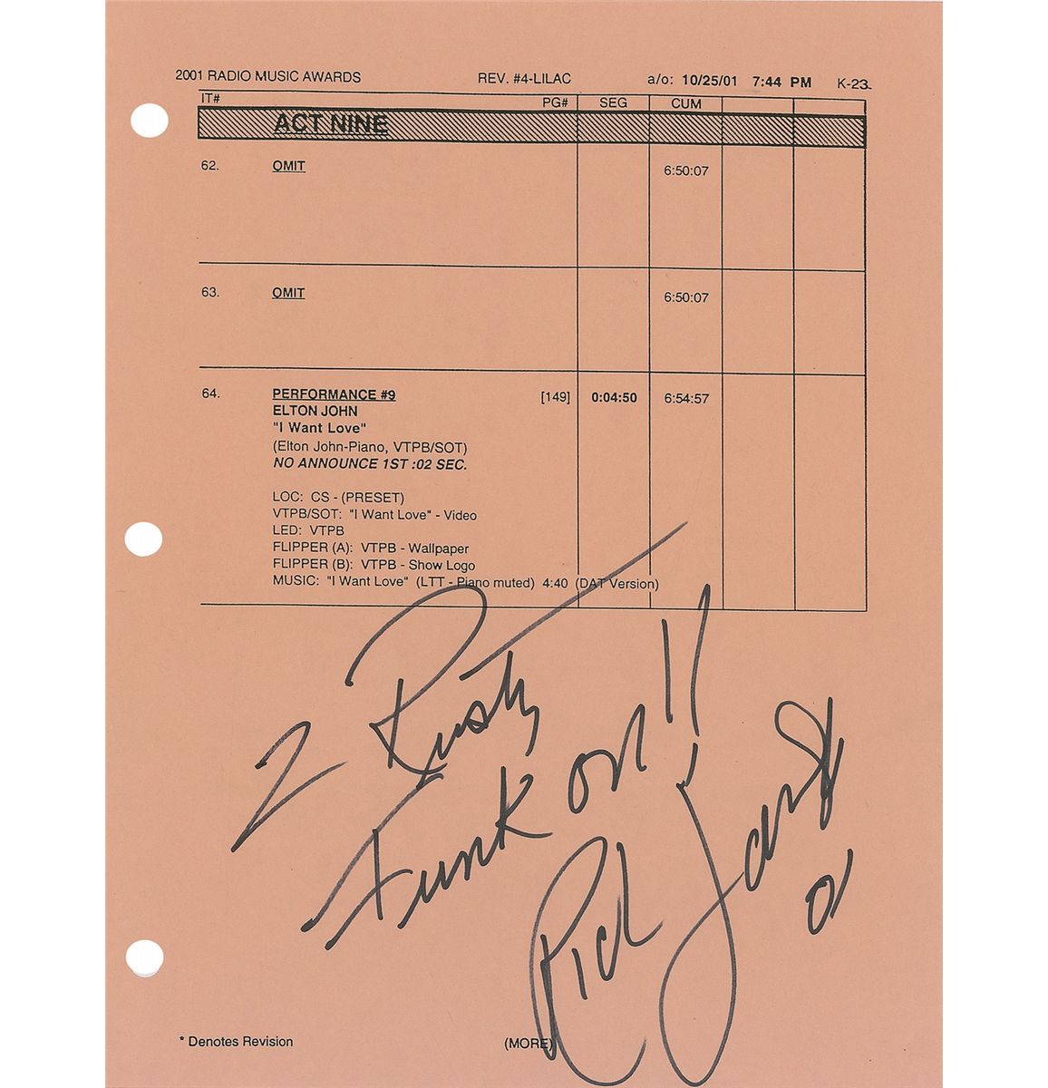 Felt tip signature and inscription, “2 Rusty, Funk on!! Rick James, 01,” on an 8.5 x 11 schedule sheet from the 2001 Radio Music Awards. Includes a similar page from the 2003 Radio Music Awards signed in black felt tip by Darryl ‘DMC’ McDaniels, “DMC, Jam J RIP.” In fine condition. Accompanied by an official guest pass for the 2003 event.