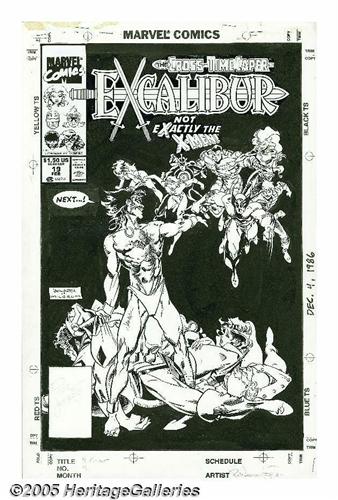 <B>Rick Leonardi and Al Milgrom - Excalibur #19 Cover Original Art (Marvel, 1986).</B></I> In an alternative reality, Jamie Braddock takes on Excalibur and the "X-Men" on this cover illustration by penciler Rick Leonardi and inker Al Milgrom. From the Chris Claremont story, "The Cross-Time Caper Part Eight: Madripoor Knights," this Leonardi/Milgrom cover has an image area of 10" x 15," and is in Excellent condition. Includes the original logo and title type, and masthead paste-up art. Signed by Rick Leonardi.