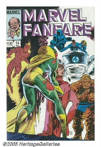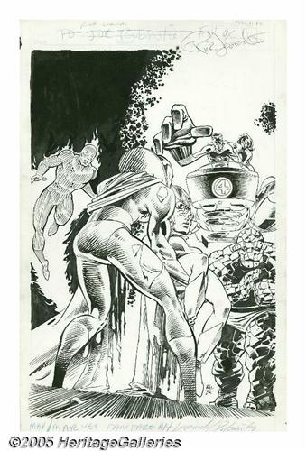 <B>Rick Leonardi and Joe Rubinstein - Marvel Fanfare #14 Cover Original Art (Marvel, 1984).</B></I> A tattered and torn Vision, with the Scarlet Witch in his arms, faces off with four of the most powerful people on the planet, the Fantastic Four, in this startling cover illustration by penciler Rick Leonardi and inker Joe Rubinstein. The Vision plays a dangerous game, in this cover for the story, "Dangerous Vision." The image area measures 10" x 15", and the art is in Excellent condition. Includes a copy of <B>Marvel Fanfare</B></I> #14. Signed by Rick Leonardi and Joe Rubinstein.