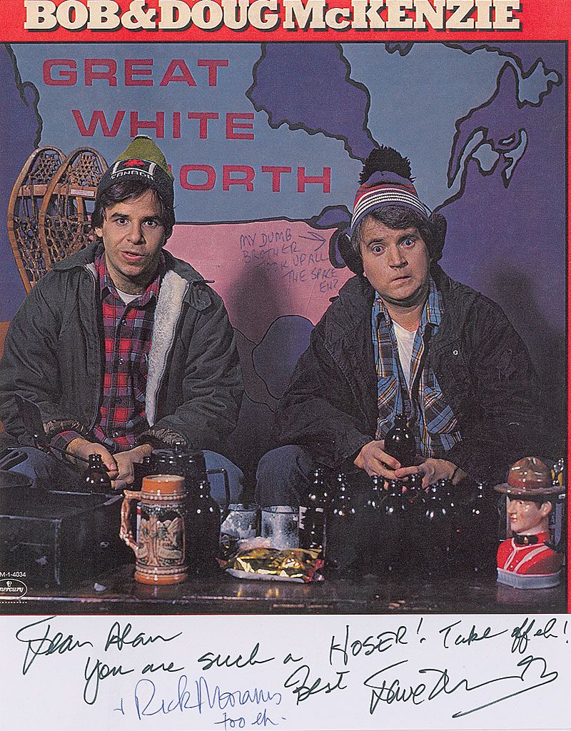 Color 8 x 10 cardstock photo of Bob and Doug McKenzie on the set of Great White North, signed and inscribed in black felt tip, “Dear Alan, You are such a hoser! Take off eh! Best, Dave Thomas,” and in blue ballpoint, “& Rick Moranis too eh.” Moranis also adds, “My dumb brother took up all the space eh?” with an arrow pointing to Thomas. In fine condition.