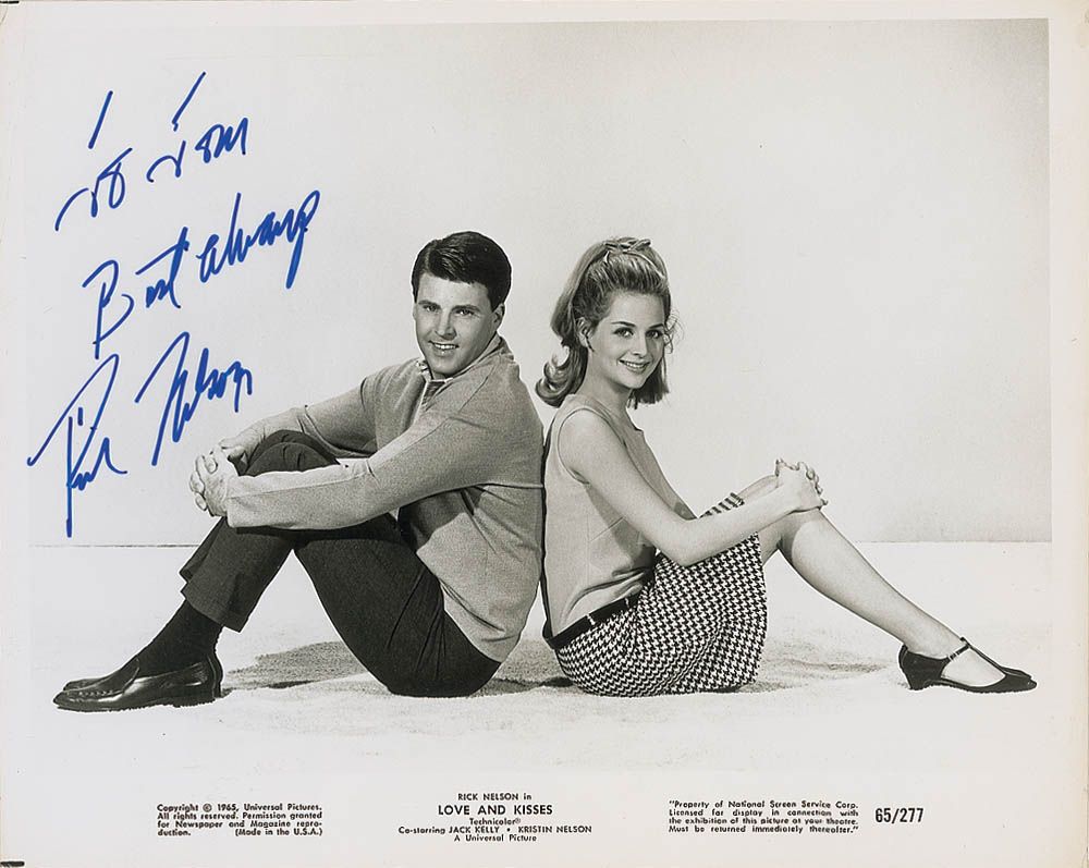 Glossy 10 x 8 Universal Pictures promotional photo for Love and Kisses, signed and inscribed in blue felt tip “To Tom, Best always, Rick Nelson.” In fine condition, with a few light edge creases.