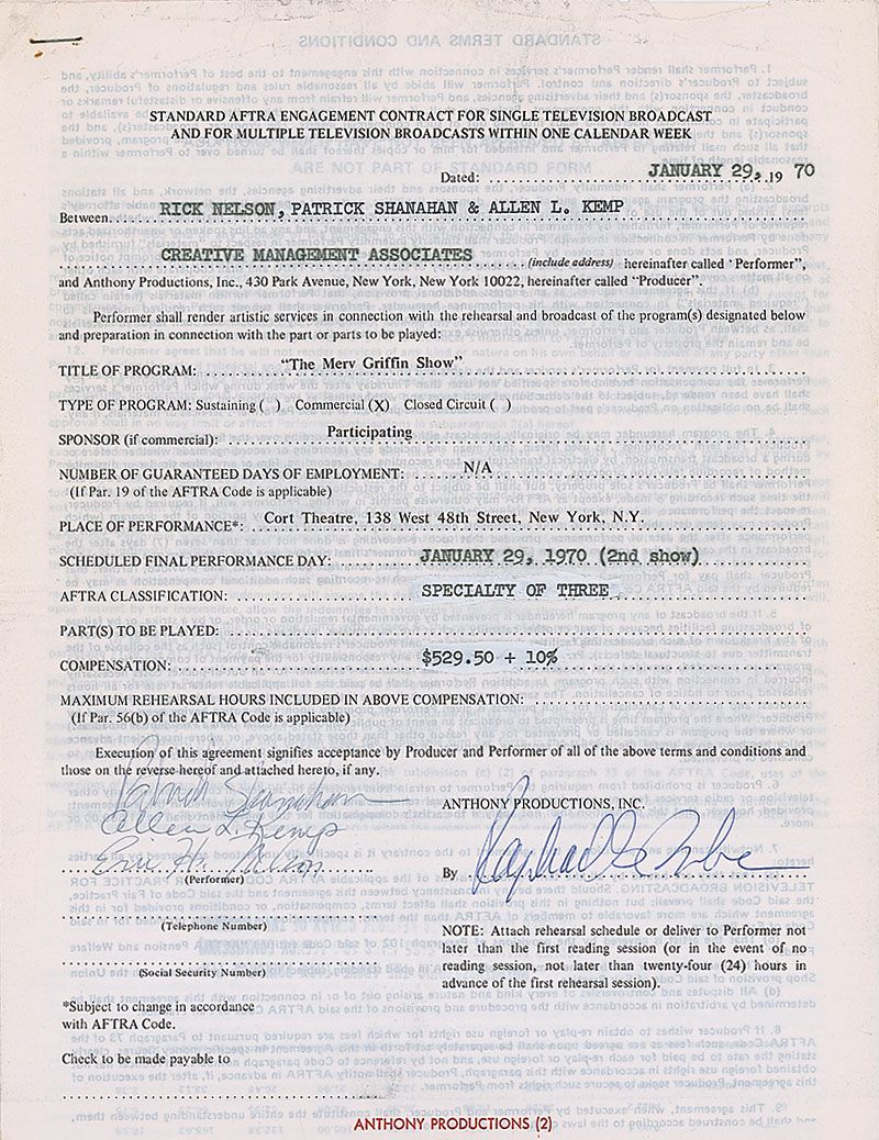 DS, one page, 8.5 x 11, January 29, 1970. Standard AFTRA contract in which Nelson, Patrick Shanahan, and Allen Kemp agree to appear on The Merv Griffin Show on the same day in exchange for $529.50 plus a 10% agency commission. Signed at the conclusion in ballpoint by Shanahan, Kemp, and Nelson with his given name, “Eric H. Nelson.” A standard AFTRA rider is stapled to the main document in the upper left. In fine condition, with expected document wear.