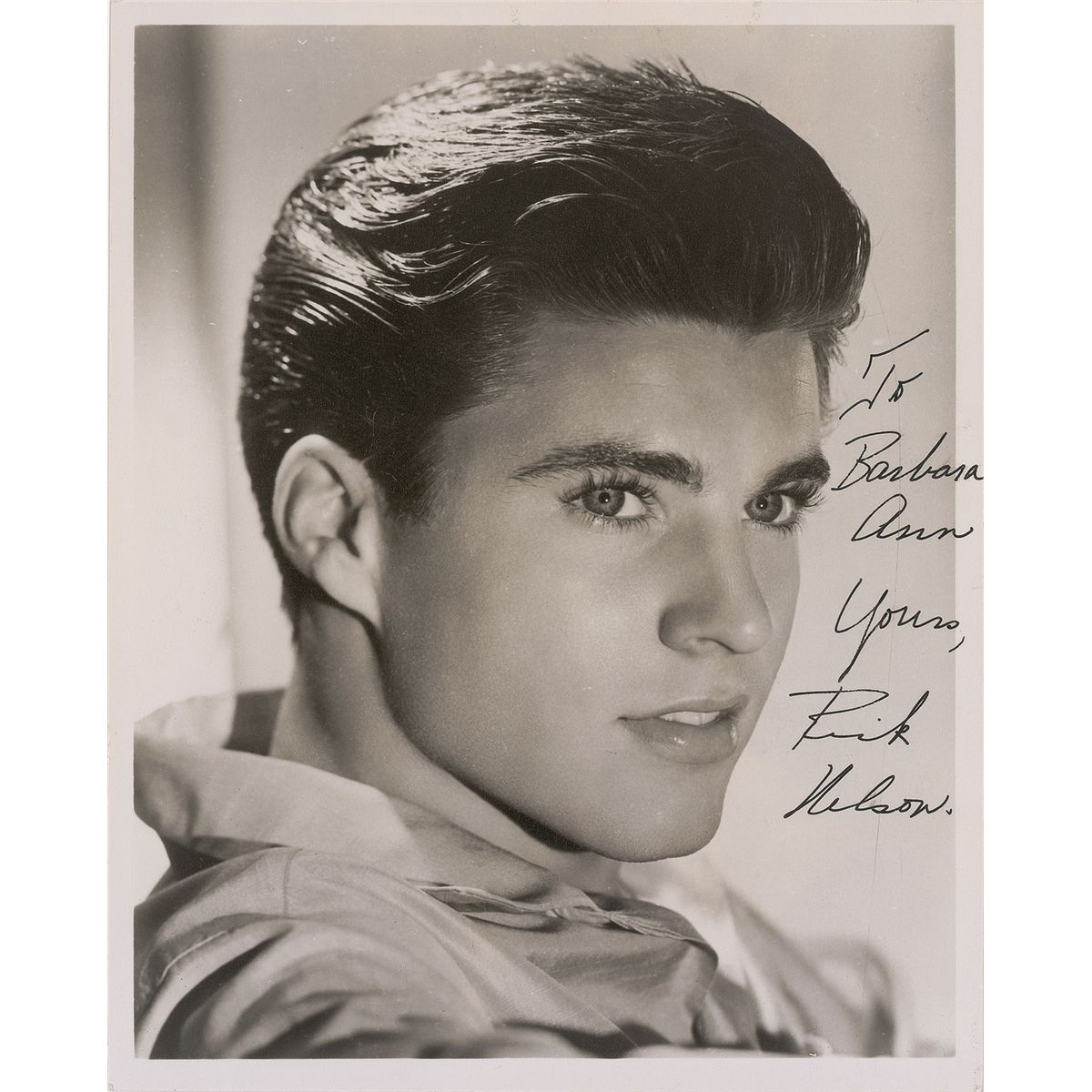 Handsome matte-finish 8 x 10 head-and-shoulders photo, boldly signed and inscribed in black ink, “To Barbara Ann, Yours, Rick Nelson.” In fine condition, a mild surface crease to right edge.