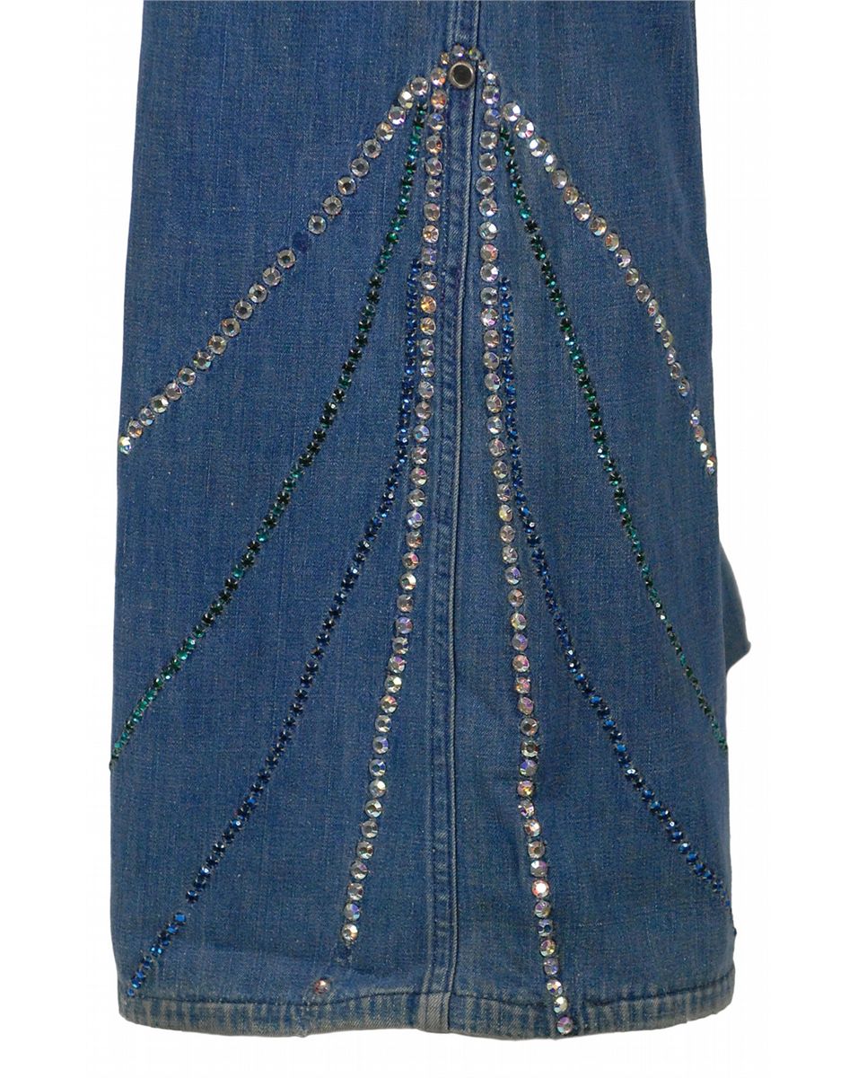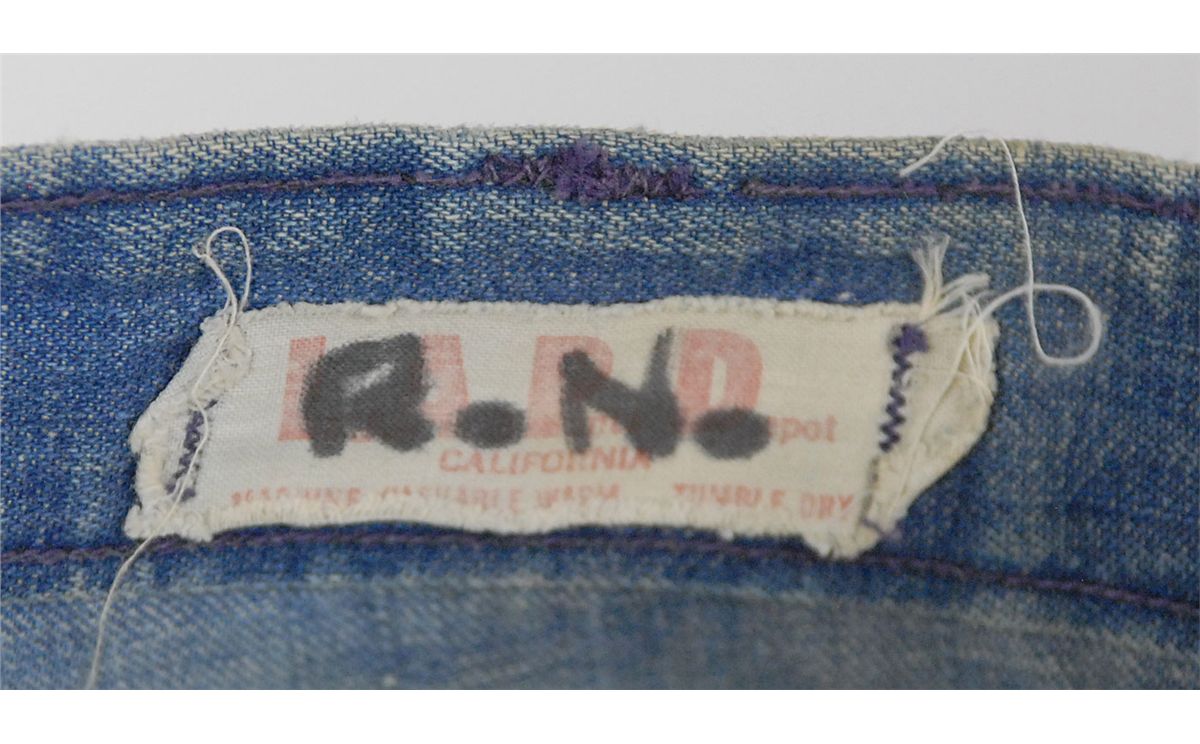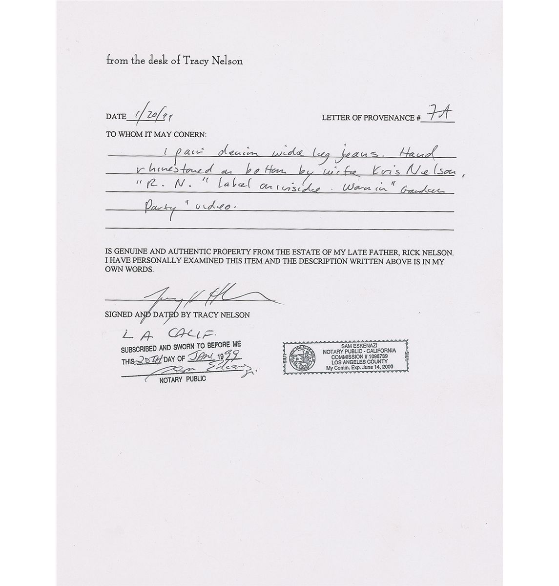 Two pieces of Nelson’s custom-made clothing: his circa 1970 stage-worn denim shirt featuring two breast pockets, decorated on the shoulders, back, and cuffs with rhinestones hand-applied by his wife Kris Nelson. Also includes similarly styled screen-worn wide-leg denim jeans, also decorated with hand-applied rhinestones on the sides of the pant legs; the inner waistband bears a tag hand-labeled with his initials, “R. N.” These pants were worn in his ‘Garden Party’ music video as well as various concert performances. In fine condition, with general wear from use. Accompanied by notarized letters of provenance for both pieces signed by Nelson’s daughter, Tracy Nelson, confirming that they are genuine and authentic property from her father’s estate; also includes several images of Nelson in the clothing. A fantastic and unique pairing from the teen idol.