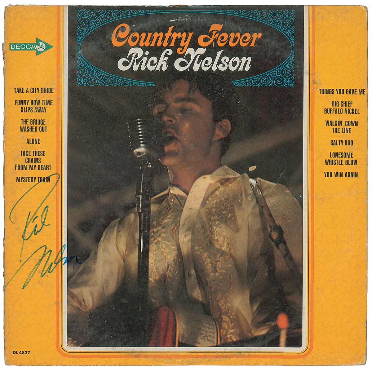Country Fever album signed on the front cover in blue felt tip. In very good condition, with slight creasing and edgewear, a light ‘ring of wear’ to upper portion, and small tears and splitting to the spine. The record is included.