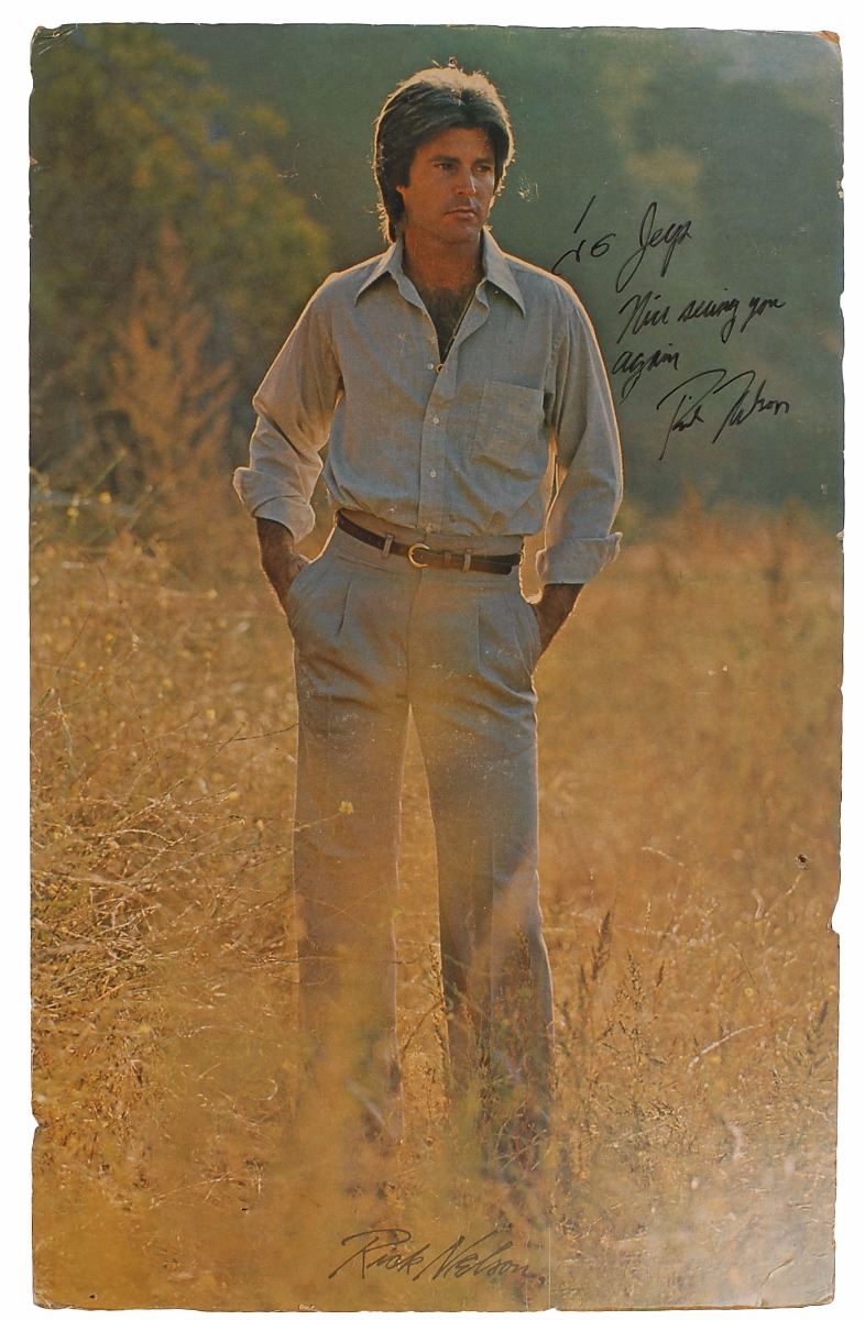 Color 22 x 34.75 poster featuring a full-length image of Nelson posing in a field, signed and inscribed in black felt tip, “To Jeep, Nice seeing you again, Rick Nelson.” Lower portion of poster bears a facsimile signature. Mounted to a same-size sheet of foam core and in very good to fine condition, with somewhat rough edges, and two small holes (one directly above Nelson’s head). Oversized.