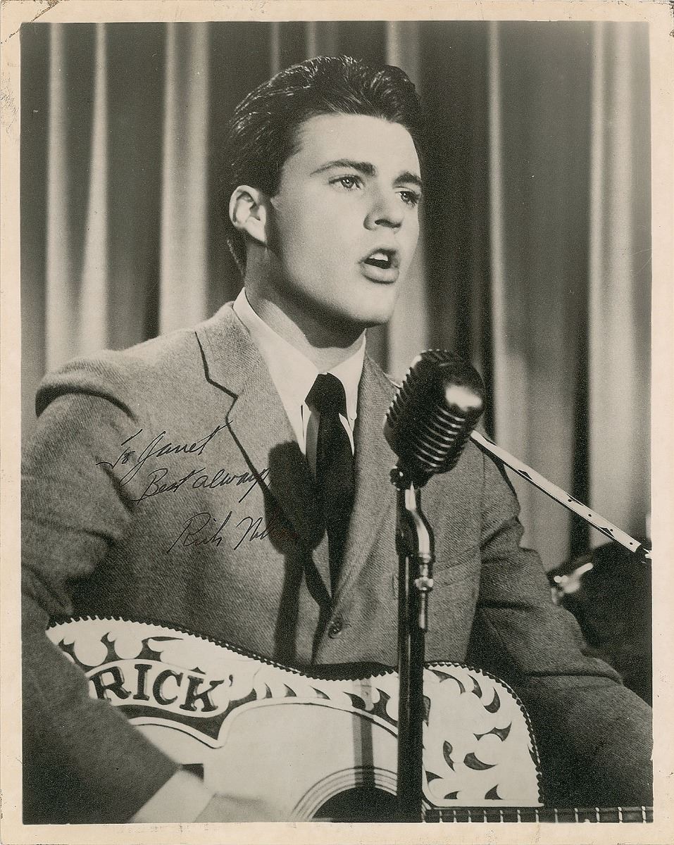 Vintage matte-finish 8 x 10 photo of Nelson performing, signed and inscribed in fountain pen, “To Janet, Best always, Rick Nelson.” In fine condition, with some creasing and staining to edges.