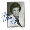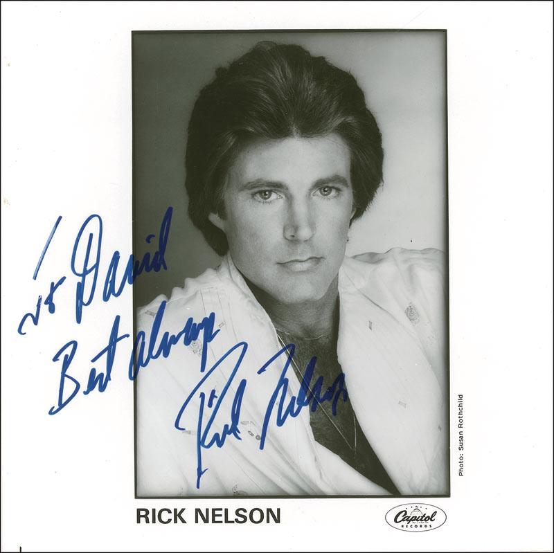 Glossy 8 x 8 photo, signed and inscribed in blue felt tip “For David, Best always, Rick Nelson.” In fine condition.