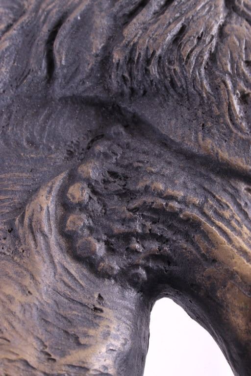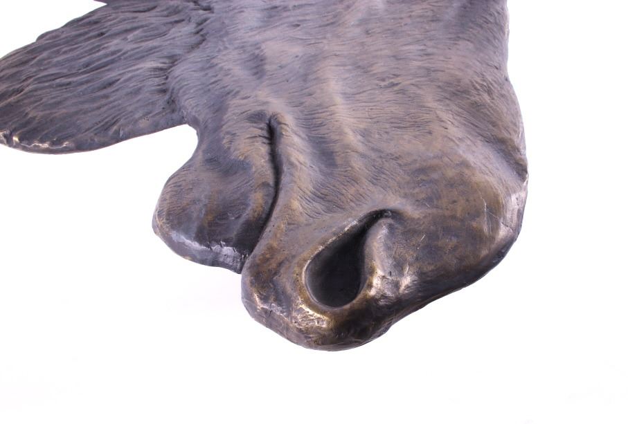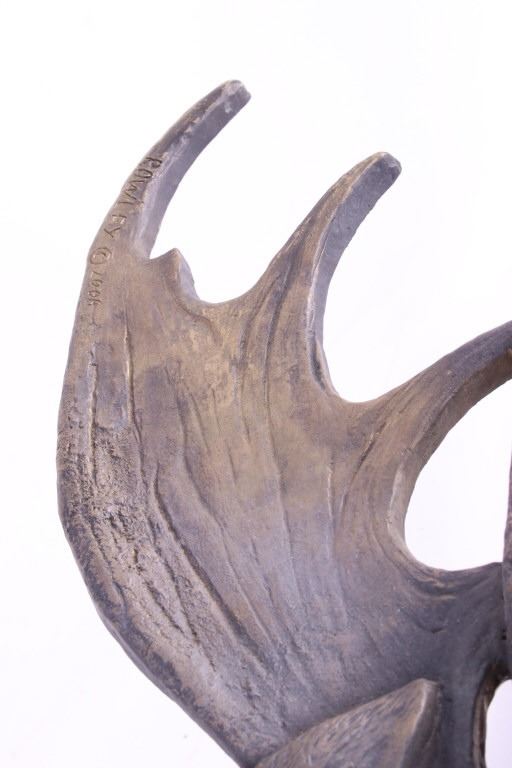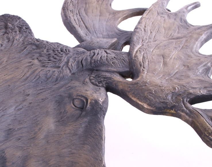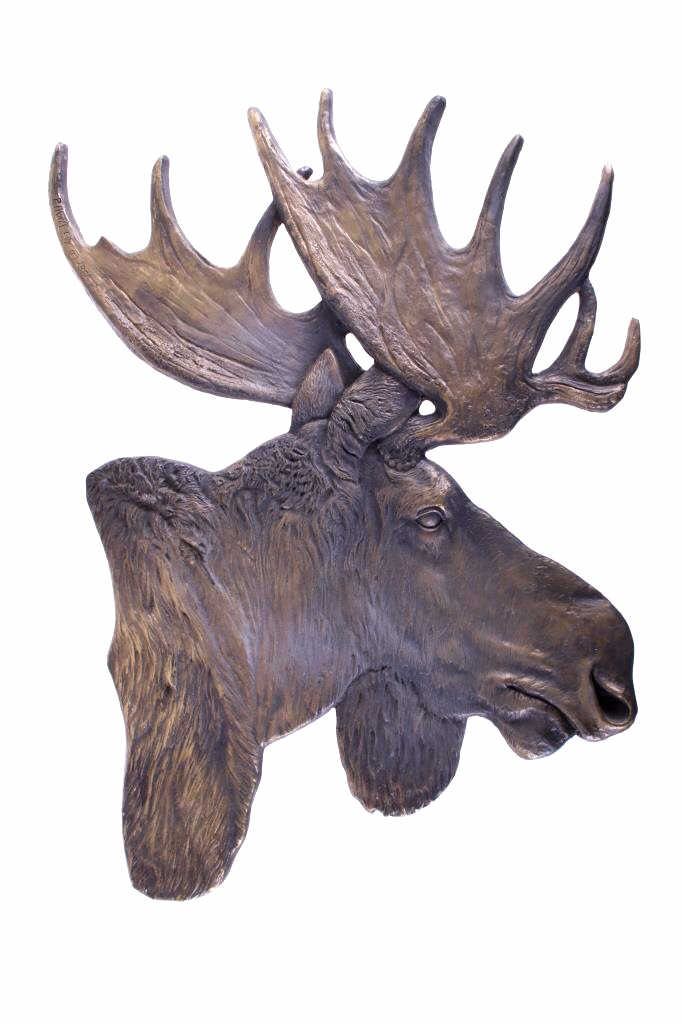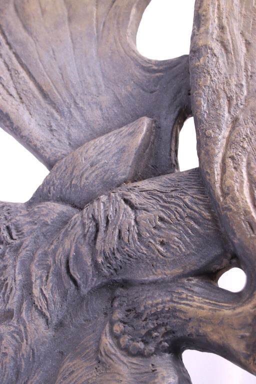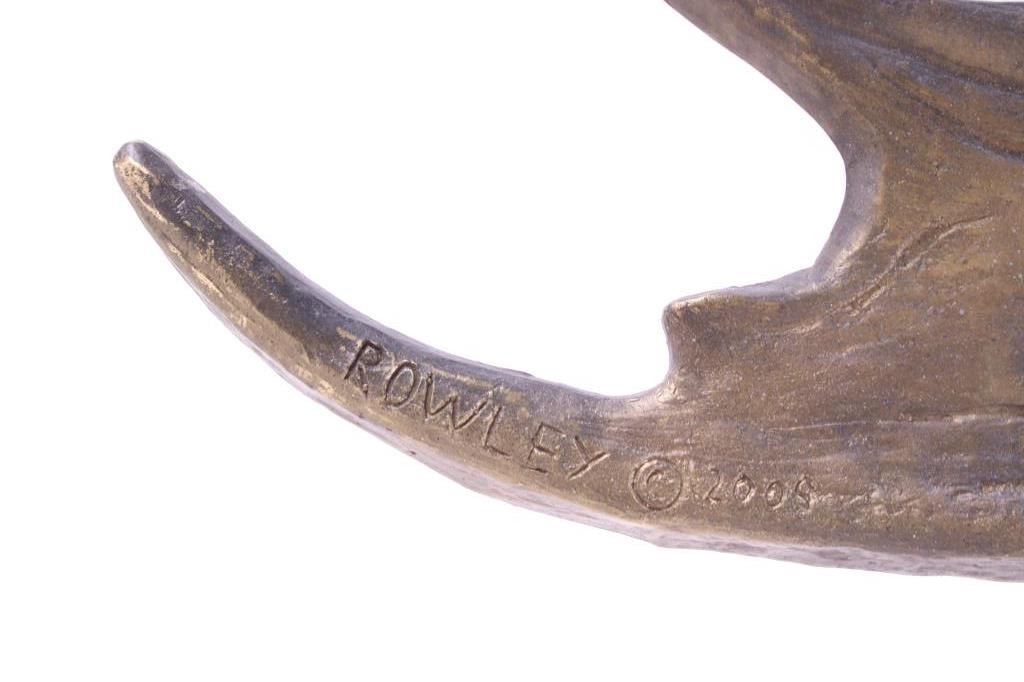 For your consideration is an original Rick Rowley moose bronze. Rick Rowley was born in the heart of Montana and raised in a small town. He spent much of his youth hiking and camping in the Rocky Mountains where his love for creativity started as a young man’s dream. The wide diversity of fine art forms manifesting from Rick’s Sedona Arizona studio exemplifies his passion for creating and proves testimony of his incredible prolific nature. Add to these traits his incessant drive toward perfection and you begin to understand Rick’s mastery of many art mediums. Sculpting in bronze, exotic woods, glass, raw metal, and stone, his 3 dimensional designs range from as small as 3 inches to heroic sizes exceeding 28 feet. This moose bronze features exceptionally fine detail work. Fine lines highlight it's "hair" and dewlap. Artist has signed and dated (2006) bronze. This image depicts a large male bull moose and measure 28.5" x 27.5" and is 0.75" thick.