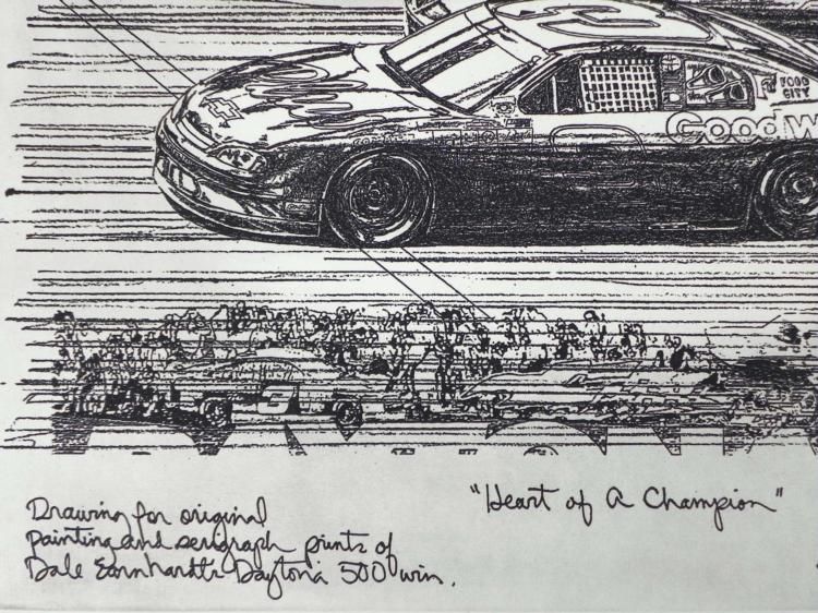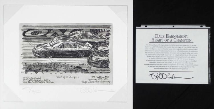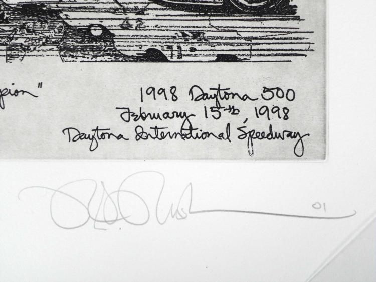 Superimposed on this brilliant rendering from America's Sports Artist Rick Rush, are three poignant moments from Daytona: Earnhardt's unforgettable victory drive by jubilant and congratulatory pit-crew and his subsequent wheely-produced "3" on the grass infield; and a glimpse into the past of the storied race 40 years ago when Lee Petty, father of Richard Petty, basked in the glory as the race's inaugural winner. * Artist: Rick Rush * Title: "Heart of a Champion" * Medium: Etching Print * Edition: numbered in pencil, 299/300Date: 2001 * Image Size: 9 3/4" x 14 1/4" * Overall Size: 15" x 18 3/4"Signature: in pencil, lower rightCertificate of Authenticity: Included and numbered * Condition: ExcellentBiography * Sports artist Rick Rush has accepted the challenge to fill the void in American art. His finger on America's pulse, Rick Sees what sports represent. At its best, sport art counteracts our knowledge of life's brevity and savors the intensity of a moment in motion. The essence of sports is a fleeting moment of intense exuberance - life at its exhilarating. His subjects and artistic style allow the viewer to experience the drama of his exhilarating brevity. Rick's sports arts represents twenty years and various periods of painting and print making, in which concept and technique balance to visually capture the essence of sports motion and the moment of exhilarating perfection. * Influenced by the 20th century philosopher Francis Schaeffer, Rick refined his notions of the inherent value and significance of man and his activities - i.e., sports. As man is valuable, so is what man does, and sports - perhaps more than other activities - remind us of life's best moments and its brevity in the same instance.