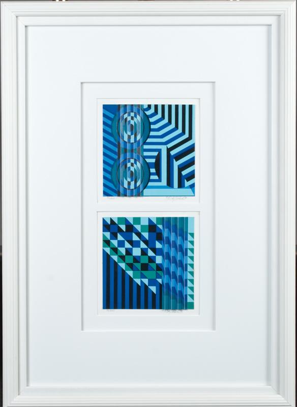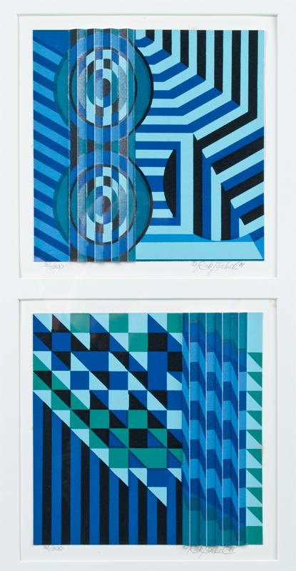 Two images in recessed matting depicting 3-d geometric images. Both signed below in pencil in LR and both edition no. 32/300 in LL. Rick Tunkel, American, 20th century. 26.5" H x 19" W, including frame.