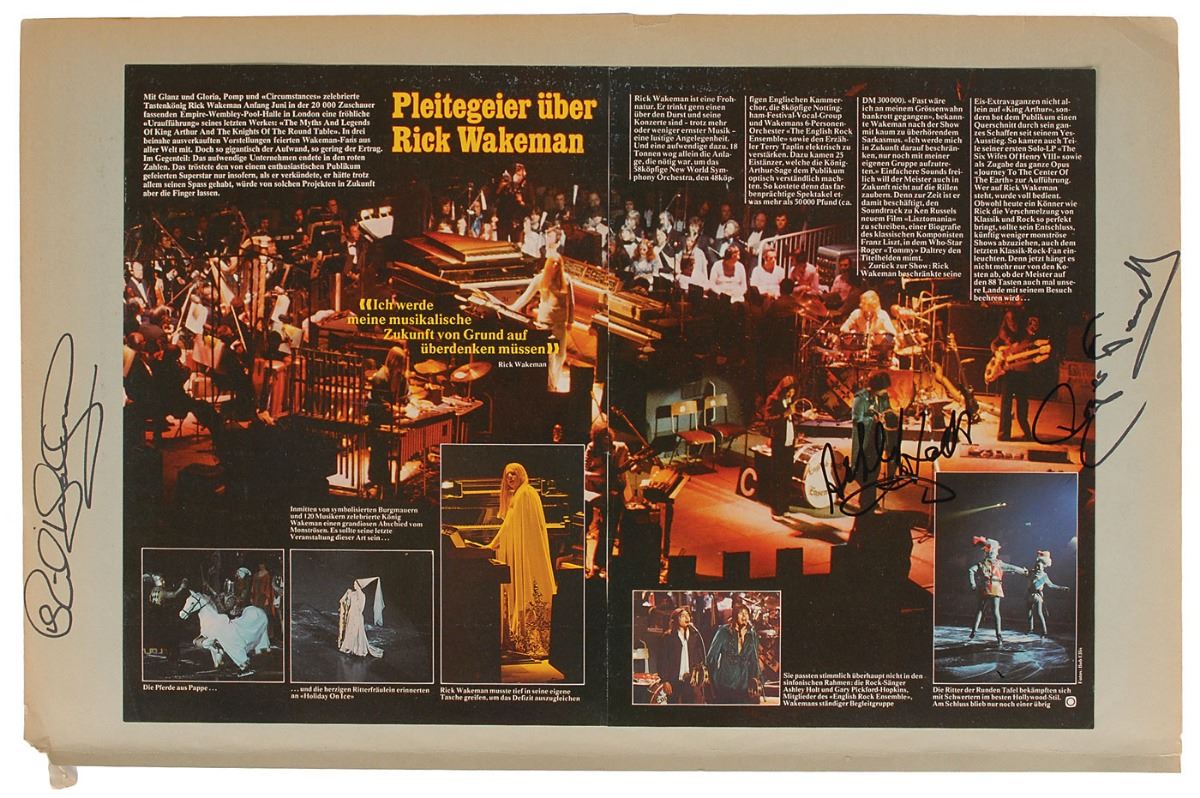 Three items: a color 10 x 12 German magazine photo of Rick Wakeman, signed in black felt tip; a 12.75 x 19.75 scrapbook page bearing affixed magazine photos of Wakeman, signed twice by Wakeman and once by Tony Fernandez; and a second scrapbook page bearing affixed magazine photos on both sides, with one side signed twice by Wakeman and the other side signed by Wakeman, Ashley Holt, and Roger Newell. In overall fine condition, with some wrinkling and handling wear. Consignor notes that these vintage signatures were obtained in person in Vienna during the early to mid-1970s.