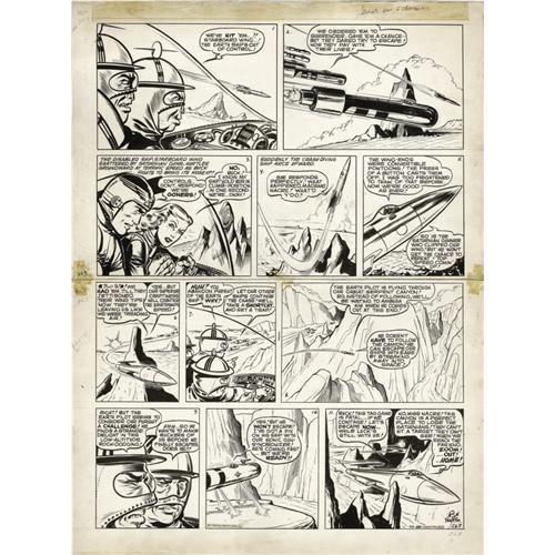 <B>Rick Yager - Buck Rogers Sunday Comic Strip Original Art (1954).</B></I> Originally hired as an assistant to Russell Keaton, Rick Yager eventually took over the strip when Keaton left. This outstanding Sunday is from the height of his run, and features Buck and Wilma in a tight spot, being chased by enemy rockets. The art consists of two 13.5" x 20.5" panels, each with an image area of 18" x 12.25". The art is in Very Good condition, with some minor tape stains.