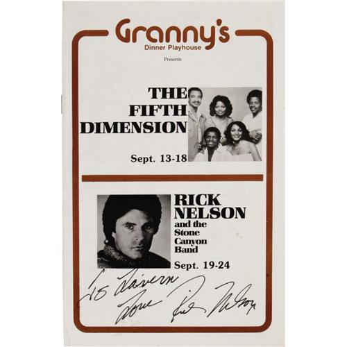 <B>Ricky Nelson Signed Program.</B></I> A concert program for a late '70s performance inscribed "To Lavern/Love Ricky Nelson" by the late singer in black ink. in Very Good condition with some minor wear and soiling and a large piece missing from the back cover. <I>With COA from PSA/DNA.</B></I>