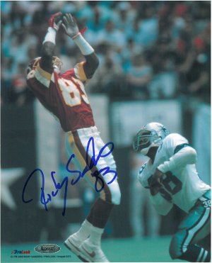 Ricky Sanders had his best season in 1988 when he finished fifth in the NFL on receiving yards with 1148 yards and second in receiving touchdowns with 12, a Redskins record. In Super Bowl XXII, Sanders had one of the greatest performances in NFL history, catching nine passes for 193 yards and two touchdowns, while also returning three kickoffs for 46 yards. He set Super Bowl records for most receiving yards (193), most total yards (235) and longest touchdown reception (80 yards, tie) in Washington's 42-10 win over the Denver Broncos. Ricky has hand signed this Washington Redskins 8x10 Photo. Tri Star Productions Hologram and Certificate of Authenticity.