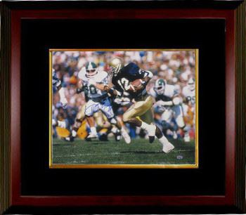 Ricky Watters arrived at Notre Dame in 1987 as a highly touted member of head coach Lou Holtz's second recruiting class. Following the departure of Heisman Trophy winner Tim Brown, Holtz moved Watters to Brown's flanker position for the 1988 season to ignite the Irish passing attack. The move paid dividends as Watters led the team in receiving. Watters' contribution on special teams was equally impressive as he returned two punts for touchdowns. Ricky Watters has hand signed this Notre Dame Fighting Irish 16x20 Photo #12. Certificate of Authenticity from Athlon Sports Collectibles. Custom Black Mat and Premium Mahogany Color Framed as shown.