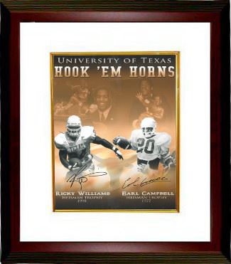 At the University of Texas, Earl Campbell won the Heisman Trophy in 1977 and led the nation in rushing with 1,744 yards. He was also a consensus All-America choice in 1977. He was selected as the Southwest Conference running back of the year in each of his college seasons and finished with 4,444 career rushing yards. Ricky Williams holds or shares 20 NCAA records while at Texas, and became the NCAA Division I-A career rushing leader in 1998 with 6,279 yards. Williams won the Heisman Trophy in 1998, becoming the second Texas Longhorn to win this honor. This "Hook Em Horns" Texas Longhorns 16x20 Photo is hand autographed by Earl Campbell and Ricky Williams. Certificate of Authenticity from Athlon Sports. Custom White Mat and Premium Mahogany Color Framed as shown.