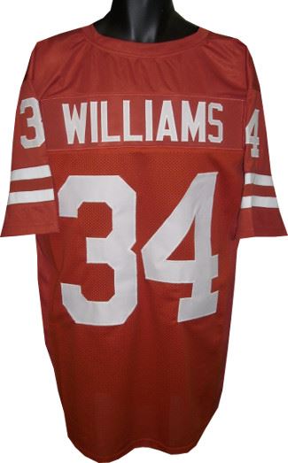 Ricky Williams played college football for the Texas Longhorns. Williams holds or shares 20 NCAA records, and became the NCAA Division I-A career rushing leader in 1998 with 6,279 yards. Williams won the 64th Heisman Trophy, becoming the second Texas Longhorn to win this honor, joining Earl Campbell. This is a Ricky Williams Texas Longhorns unsigned Orange unlicensed custom-prostyle jersey with twill stitched nameplate and numbers. perfect for autograph or to wear! Size XL