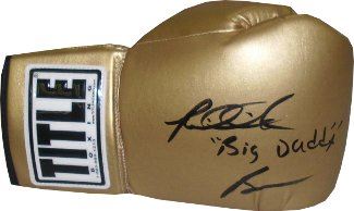 Riddick Bowe is a former two-time World heavyweight champion, first winning the WBA, WBC and IBF titles in 1992, becoming undisputed heavyweight champion. Bowe's second reign as heavyweight champion was in 1995 when he won the WBO title. His record stands at 43-1 with 33 wins by way of knock-out. Riddick Bowe has hand signed this Title Gold boxing glove and has added the inscription, "Big Daddy." MAB Hologram and Certificate of authenticity from Athlon Sports.