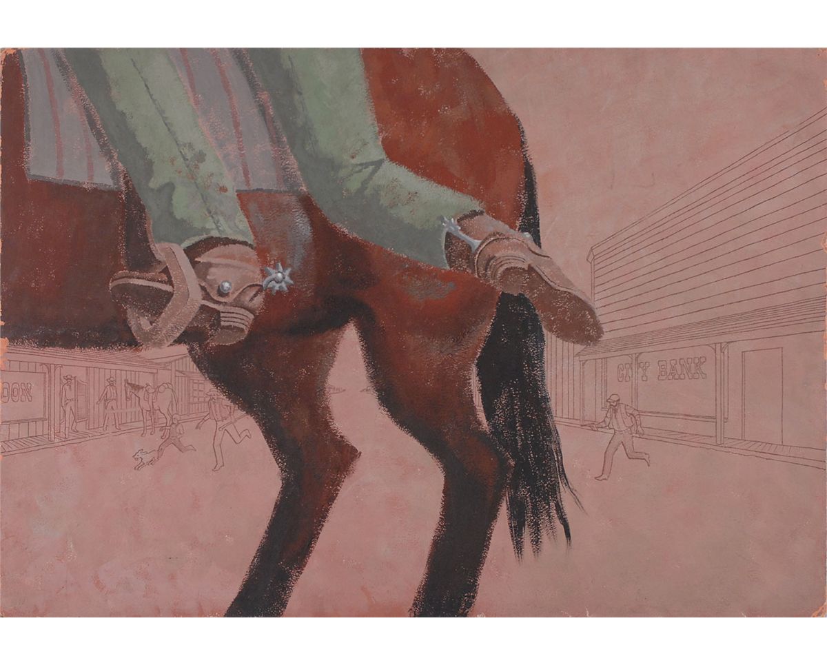 Original hand-painted title art screen-used in the opening sequence of the 1958 film Ride a Crooked Trail, gouache on a 32 x 22 sheet of illustration board, showing a cowboy’s boot in his horse’s stirrup with a classic western town in the background. Painted by noted title artist Russell E. Roberts. In fine condition, with some edge chipping.