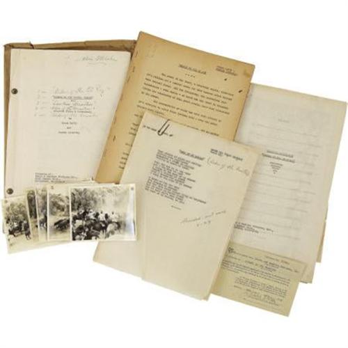 <B><I>Riders of the Frontier</B></I></B></I> <B>Document Archive.</B></I> A set of documents from production on the 1939 Tex Ritter Western that includes six b&w snapshots taken on the set (featuring Ritter and some cowboys riding herd), a story treatment (titled "Riders of the El Rey"), a dialogue continuity script, dialogue scripts for a promotional trailer, a copy of the screenplay, a Production Code certificate, and other items from the production. In overall Fine to Very Fine condition with some wear.<BR><BR><b>Shipping:</b> Books & Catalogs (<a target="_blank" href="http://www.heritageauctions.com/common/shipping.php">view shipping information</a>)
