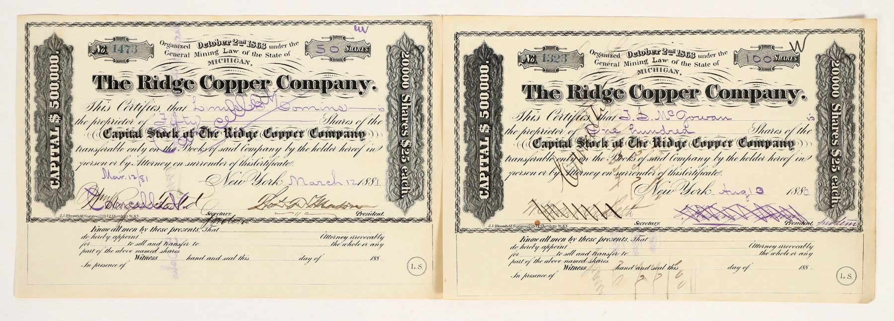 Two Ridge Copper Company Stocks. Issued. 1880 & 1881. Cancelled. Organized in 1850 as the Butler or Champion Lode. The richest of the Evergreen Range Mines. According to an 1882 Michigan State report: "The mining plant is much behind the times the machinery having been long in use needs replacing with newer and improved patterns. The compressor and power drills should replace the slow and expensive hand work. The mine needs a compressor and air drills to extend the openings with greater rapidity than is now possible. If pushed with the same vigor as the Osceola there is but little doubt that the Ridge would be a paying mine." See photos.