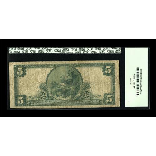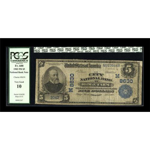<B>Ridge Farm, IL</B></I> - $5 1902 Plain Back Fr. 600 <B>The City NB</B></I> Ch. # (M)8630<BR> This Vermilion County outlet fell victim to the depression in 1934, leaving just $1,220 outstanding of its Large Size circulation. <B>PCGS Very Good 10.</B></I><BR><BR><b>Shipping:</b> Coin/Currency (<a target="_blank" href="http://www.heritageauctions.com/common/shipping.php">view shipping information</a>)
