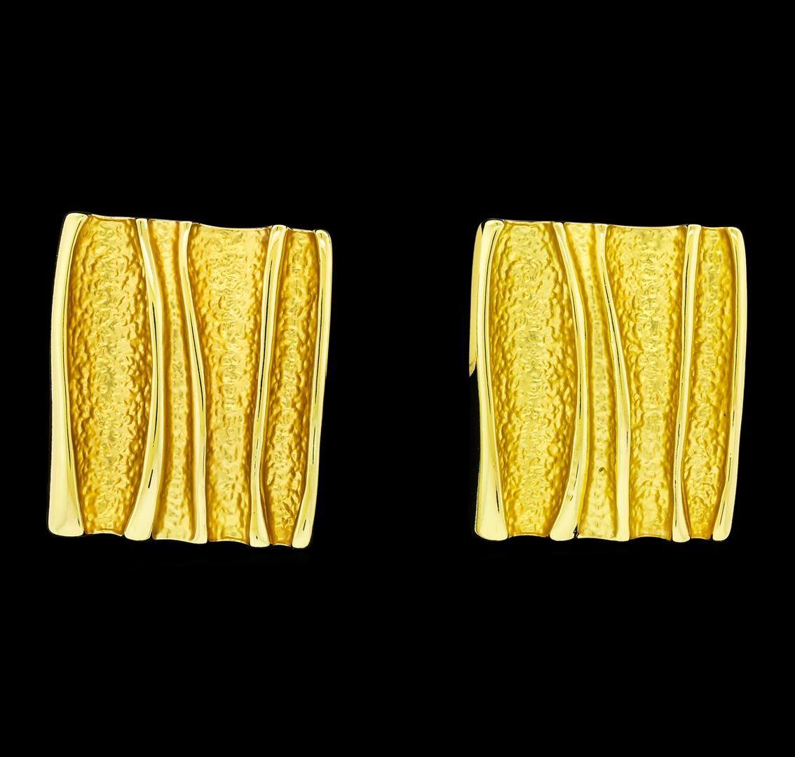 High end designer jewelry. Ridged Style Rectangle Earrings - Gold Plated. Gold Plated Post Set. Gold. 0.8x1inch. Total Weight: 13.3 grams.