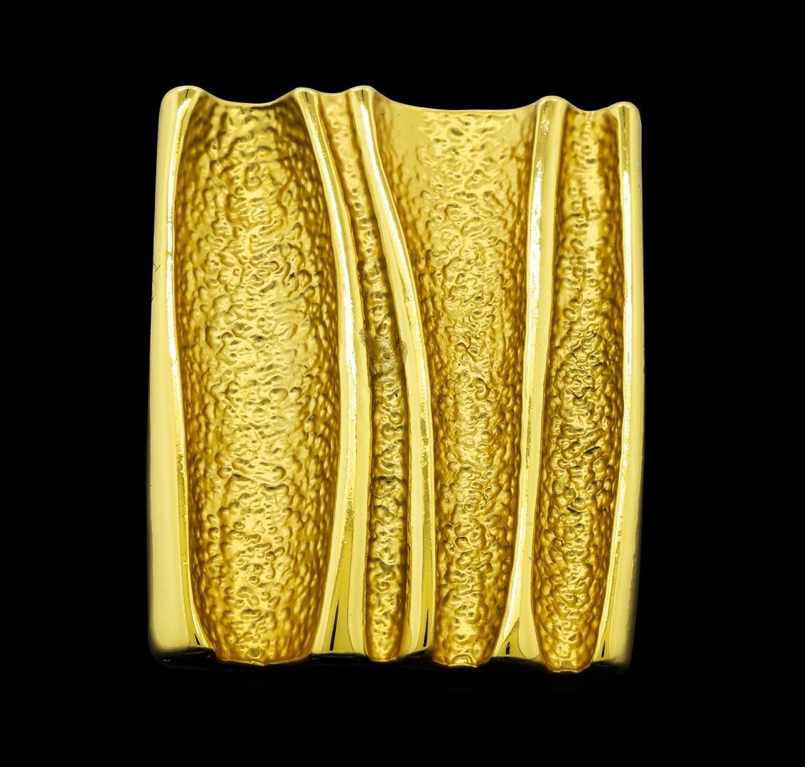 High end designer jewelry. Ridged Style Rectangle Elastic Ring - Gold Plated. Gold Plated Metal. Gold/ Gld. Elastic. Total Weight: 18.2 grams.