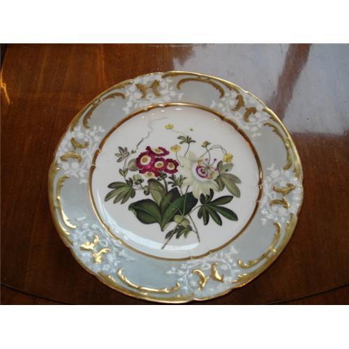 A Very Beautiful Plate, Circa 1850, From "J. W. Ridgeway & Sons, Porcelain" of England. The form of the Plate is in the Rococo Revival style, with a Pearl-Blue Background around the Border, with raised wreaths of Roses and Vines in White, Accented by Fluid Rococo Trellis-like Curves in fine Gilt work. The interior panel of the plate is painted with life-like Botanical Specimens, loosely arranged and executed with expert coloring and shading. Slight flaking to some of the painting on some of the offered plates, but in great overall condition, no chips, cracks or breaks.