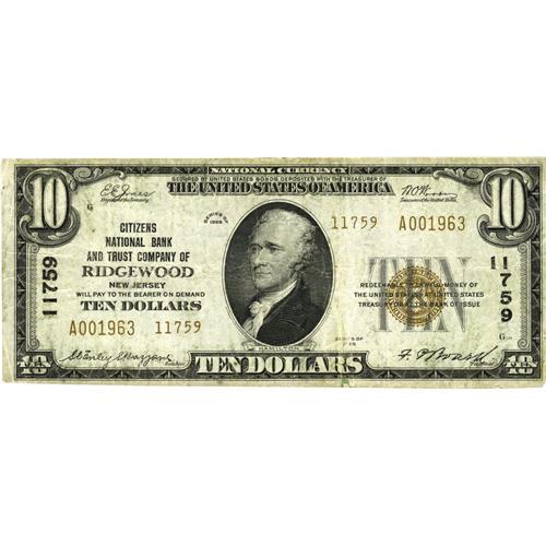 <B>Ridgewood, NJ</B></I> - $10 1929 Ty. 2 <B>Citizens NB & TC</B></I> Ch. # 11759<BR>This is one of only three Type Twos in the census for this Bergen County bank. It is brighter than usual for the grade with a rounded corner. <B>Fine.</B></I>