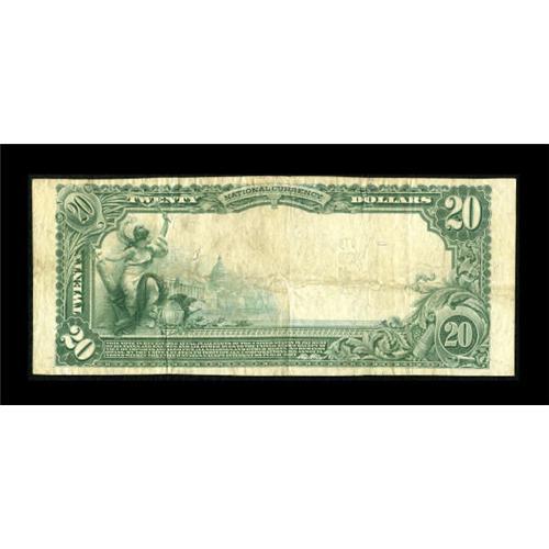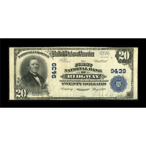 <B>Ridgway, IL</B></I> - $20 1902 Plain Back Fr. 652 <B>The First NB</B></I> Ch. # 9439<BR> This pleasing note is one of only three known large size examples for this Gallatin County issuer. The president's signature is still a bit visible and the margins are problem free. <BR><BR><b>Shipping:</b> Coins & Currency (<a target="_blank" href="http://www.heritageauctions.com/common/shipping.php">view shipping information</a>)