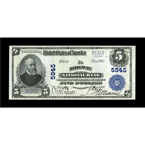 <B>Ridgway, PA</B></I> - $5 1902 Plain Back Fr. 608 <B>The Ridgway NB</B></I> Ch. # 5945<BR>A <B>Gem Crisp Uncirculated</B></I> note that sets the standard for this grade. Well balanced margins, bright paper, pack fresh crispness and unchallenged originality make for a note that even the fussiest buyer will be pleased with. Census records indicate that this is the finest known of the $5 Plain Back survivors from here. Bid accordingly.<BR><BR><b>Shipping:</b> Coin/Currency (<a target="_blank" href="http://www.heritageauctions.com/common/shipping.php">view shipping information</a>)