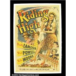 Riding High (Paramount, 1943). One Sheet (27"X41") Dorothy Lamour shines in this big band musical, with Dick Powell crooning his way into a silver mine! Very Fine on Linen.Important notice: We expect to be auctioning lots at the rate of 200-250 per hour. Sometimes eBay Premier live bid software cannot keep up with that pace, so we strongly recommend that you place a realistic proxy bid now as insurance to avoid disappointment. Also please note that all Heritage/CAA lots purchased through eBay Premier carry a 20% Buyer's Premium.